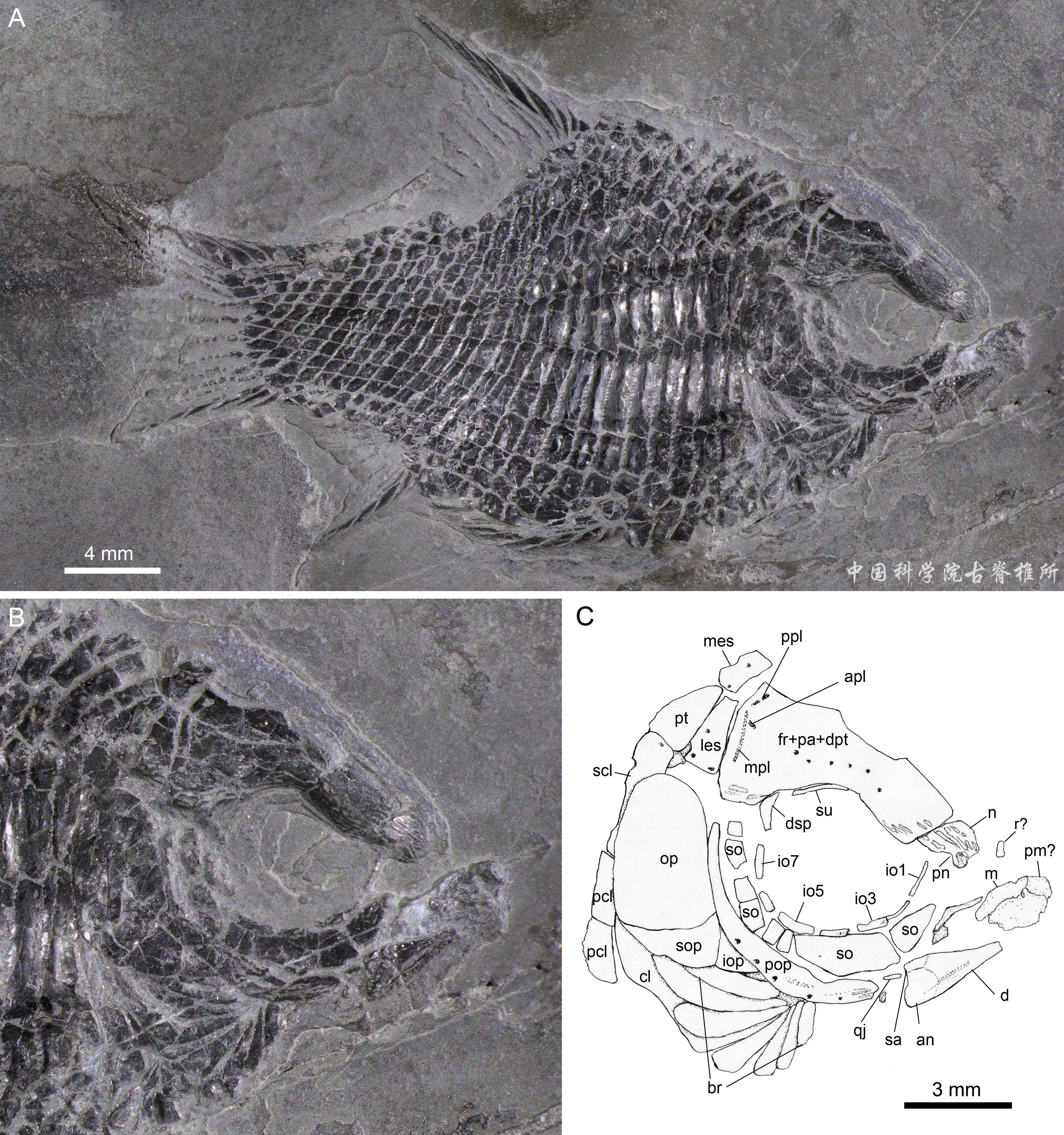 小貴州短體魚最大體長只有約4厘米,具有短而高的獨特體型,與興義生物群中的典型代表胡氏貴州龍、興義亞洲鱗齒魚和興義飛魚等共生?;瘜游坏牡刭|年代經牙形石生物地層對比和鋯石絕對年齡測定為距今約2.4億年?;谛碌臉吮?,徐光輝等重建了小貴州短體魚的頭骨和肩帶特征,并依據(jù)這些新的解剖學特征,首次將它納入分支系統(tǒng)學研究中。研究結果表明,小貴州短體魚不是古鱈目盧加諾魚科成員而是鉸齒魚類半椎魚目平體魚科(Dapediidae)最原始的成員。小貴州短體魚代表了平體魚科在中國的首次發(fā)現(xiàn),它的重新分類為研究平體魚科的起源和演化提供了重要的證據(jù)。