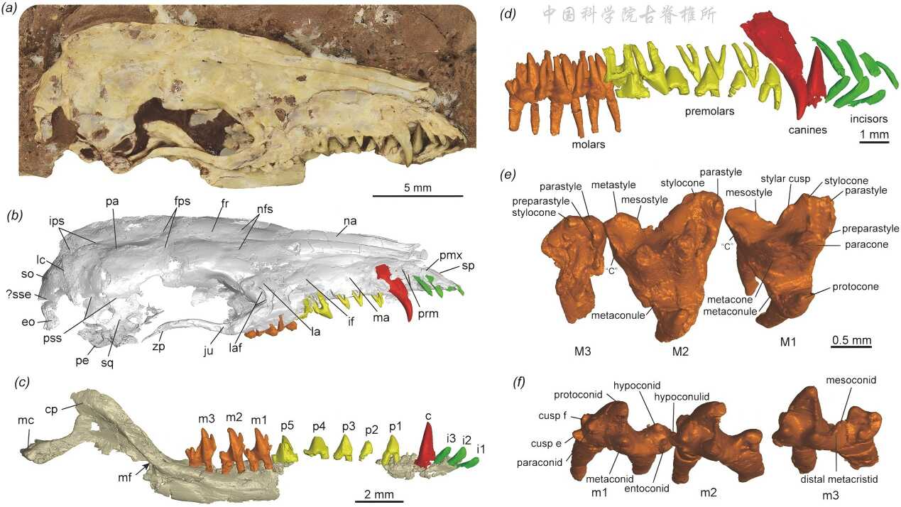 2025年12月,中國科學(xué)院古脊椎動物與古人類研究所王海冰及其團(tuán)隊,與德國波恩大學(xué)、芬蘭赫爾辛基大學(xué)、美國自然歷史博物館、成都理工大學(xué)等單位合作在Nature Index期刊《Proceedings?of the Royal Society B》發(fā)表早期獸類演化的研究成果。團(tuán)隊基于高精度CT掃描,對我國遼寧省北票市上園鎮(zhèn)早白堊世熱河生物群義縣組陸家屯層發(fā)現(xiàn)的原始真獸類——燕子溝無矢脊獸(Acristatherium yanense)進(jìn)行新研究,在新的系統(tǒng)發(fā)育框架下重建早期獸類牙齒齒式演化,結(jié)合古生物和發(fā)育生物學(xué)證據(jù),提出了真獸-后獸類牙齒齒式演化分異新假說。